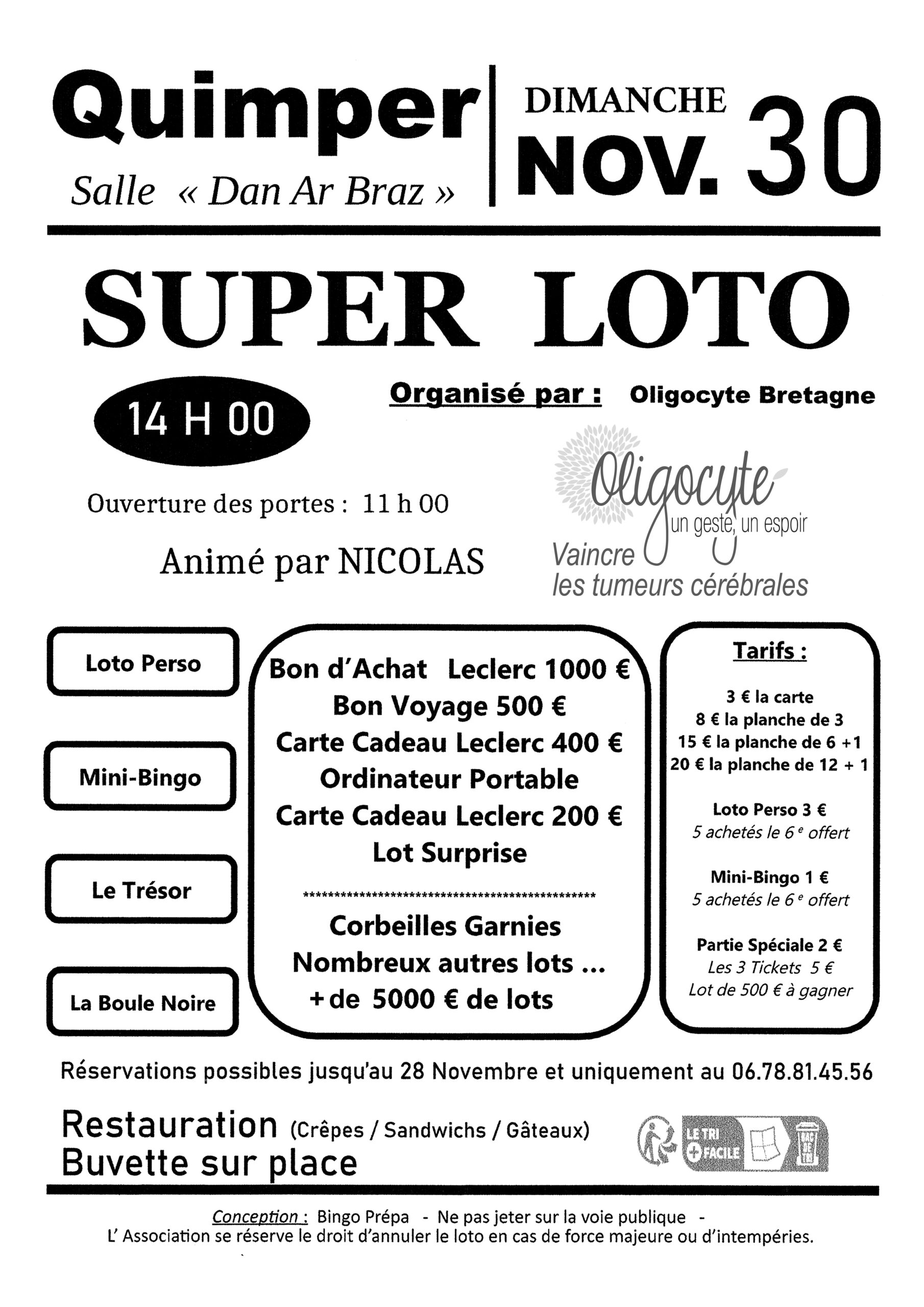 SUPER LOTO OLIGOCYTE BRETAGNE – Dim. 30 Nov. Salle Dan Ar Braz – QUIMPER